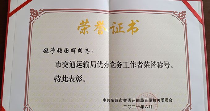 張國輝榮獲“市交通運輸局優(yōu)秀黨務(wù)工作者”