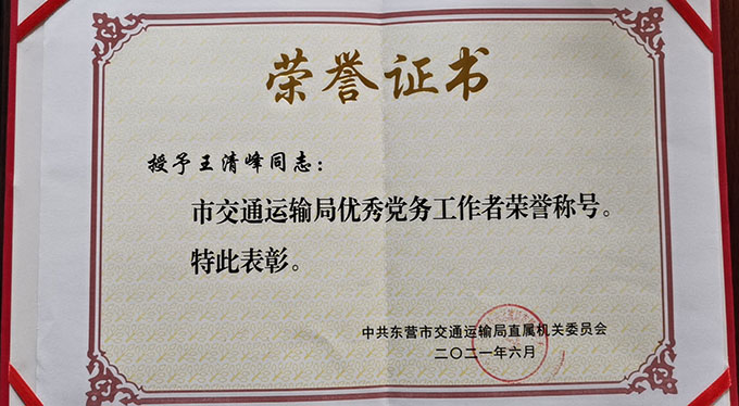 王清峰榮獲“市交通運輸局優(yōu)秀黨務(wù)工作者”